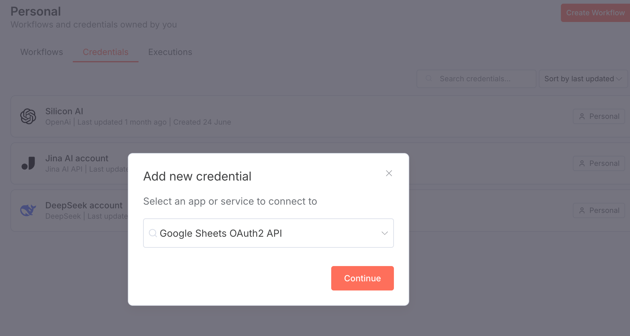 - Let’s open the n8n backend, and let’s add Google Forms API connection as an example.