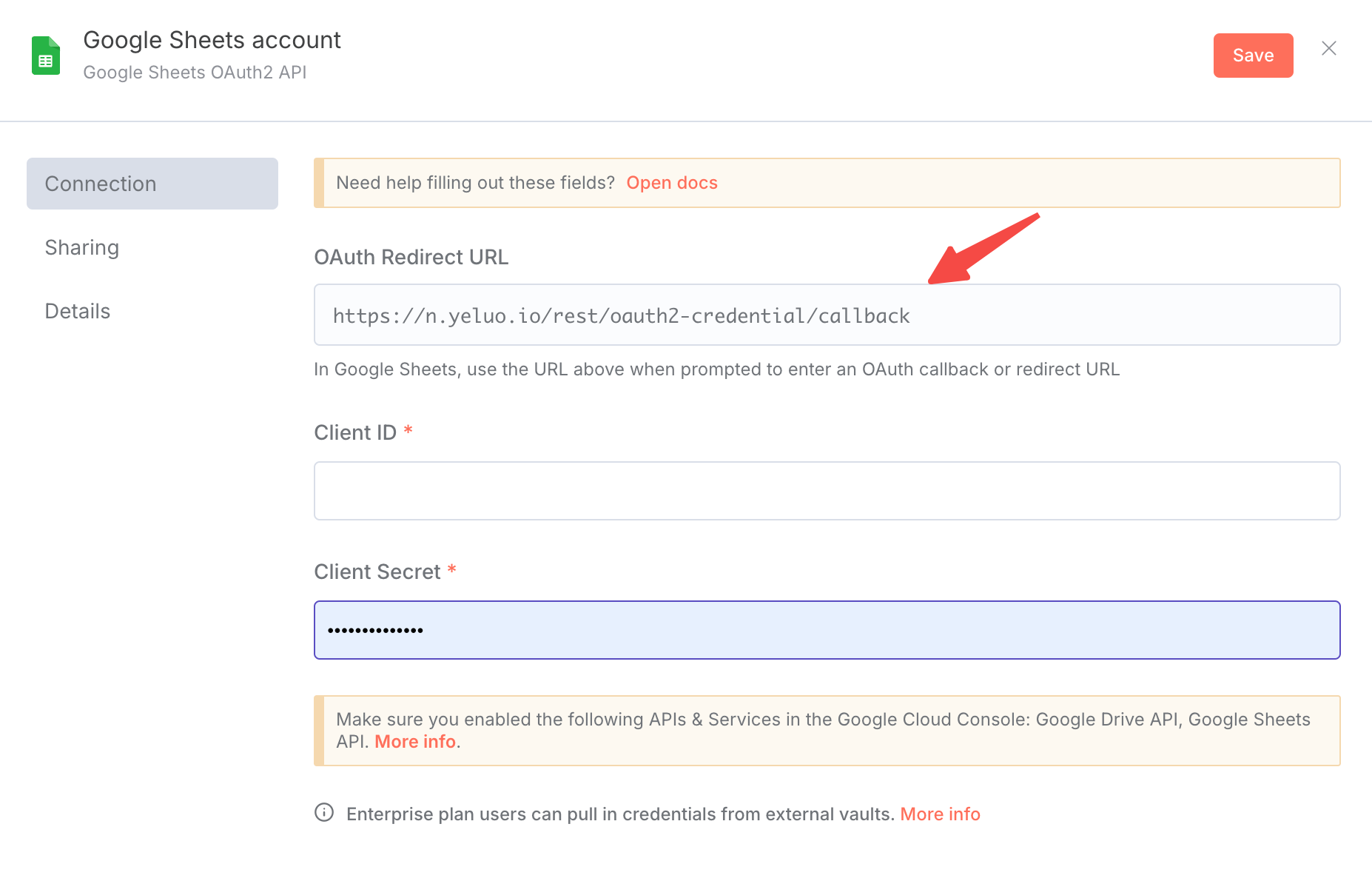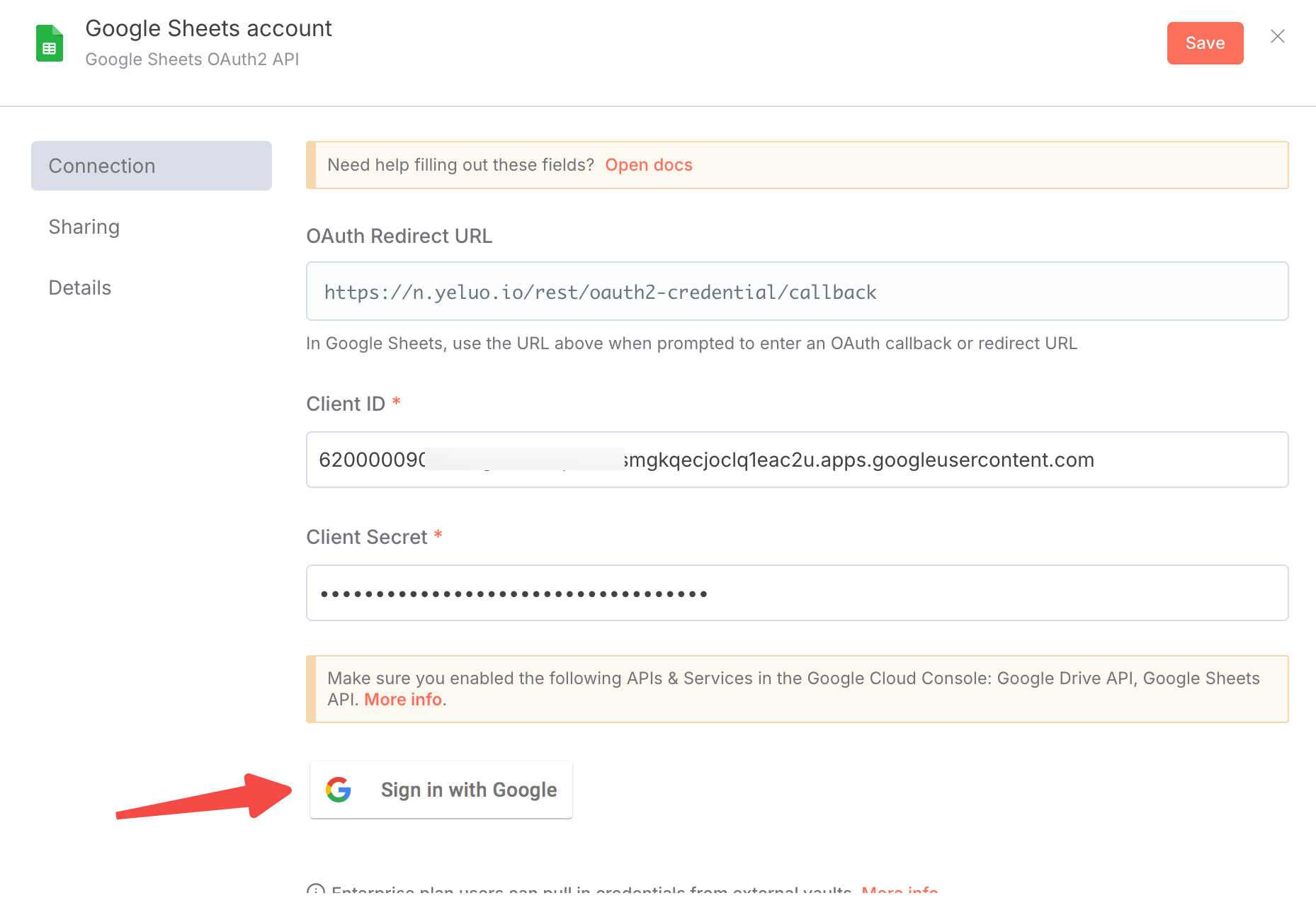 - Let’s go back to n8n backend, paste the above copied Client ID and Client secret into the corresponding location, and then click “Login to Google” to verify.