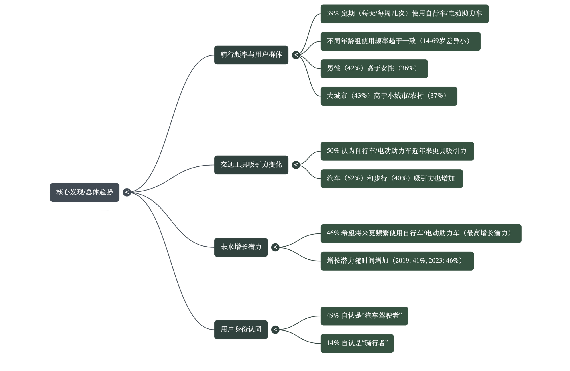 启示: “太远、太累”是阻碍非骑行者的核心痛点,而这正是 E-Bike 的杀手锏。营销话术应直击这些痛点,强调“如履平地”的轻松感,转化那些因体力原因放弃骑行的潜在用户(25% 人口)。