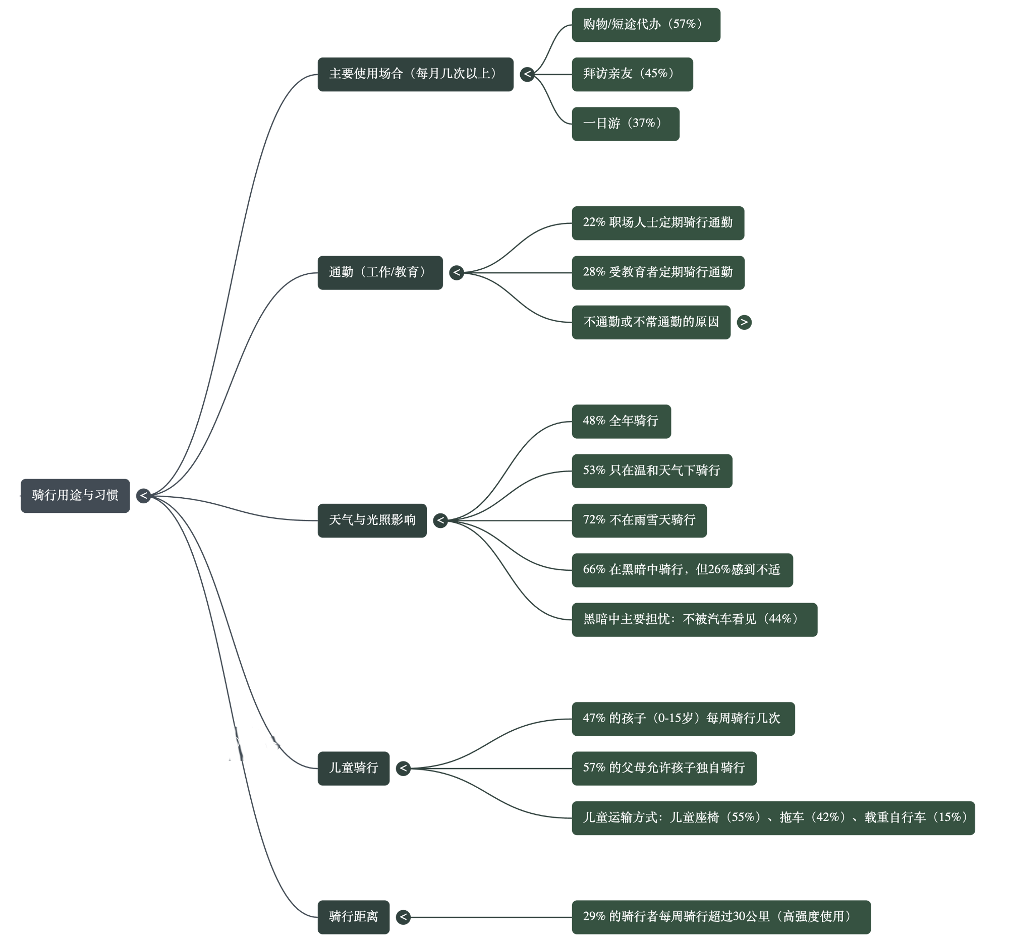 启示: 骑行不仅仅是为了运动,近 3/4 的人将主要自行车(或 E-Bike)用于基本出行(购物、办差事、访友)。“实用性”压倒了“纯运动性”。 在产品定义上,标配货架、挡泥板和高负载能力的车型将更受大众市场欢迎,尤其是针对 30-39 岁通勤主力的 E-Commuter 车型。