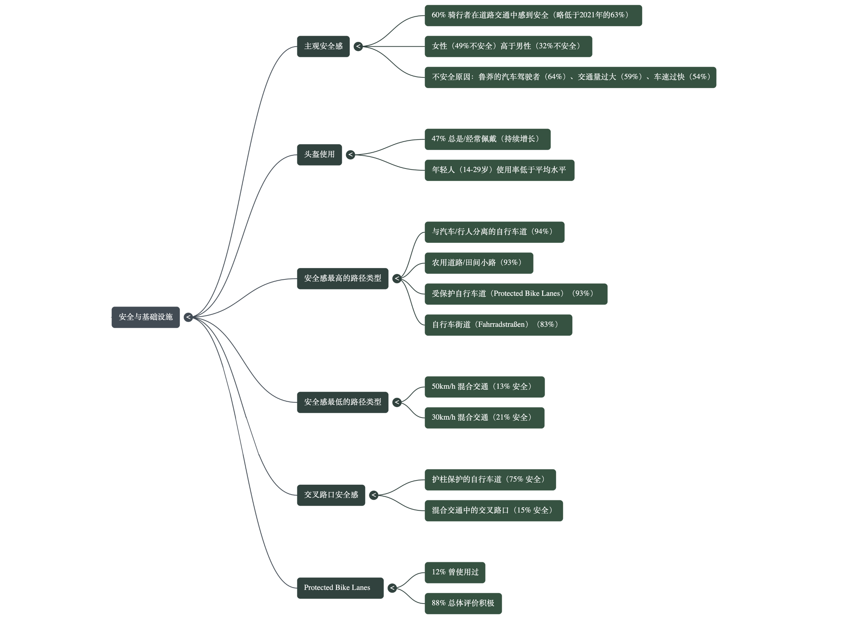 • 安全感严重不足: 40% 的骑行者在路上感到不安全。最主要的不安全因素是不体谅的汽车驾驶员(64%)和车流量过大(59%)。