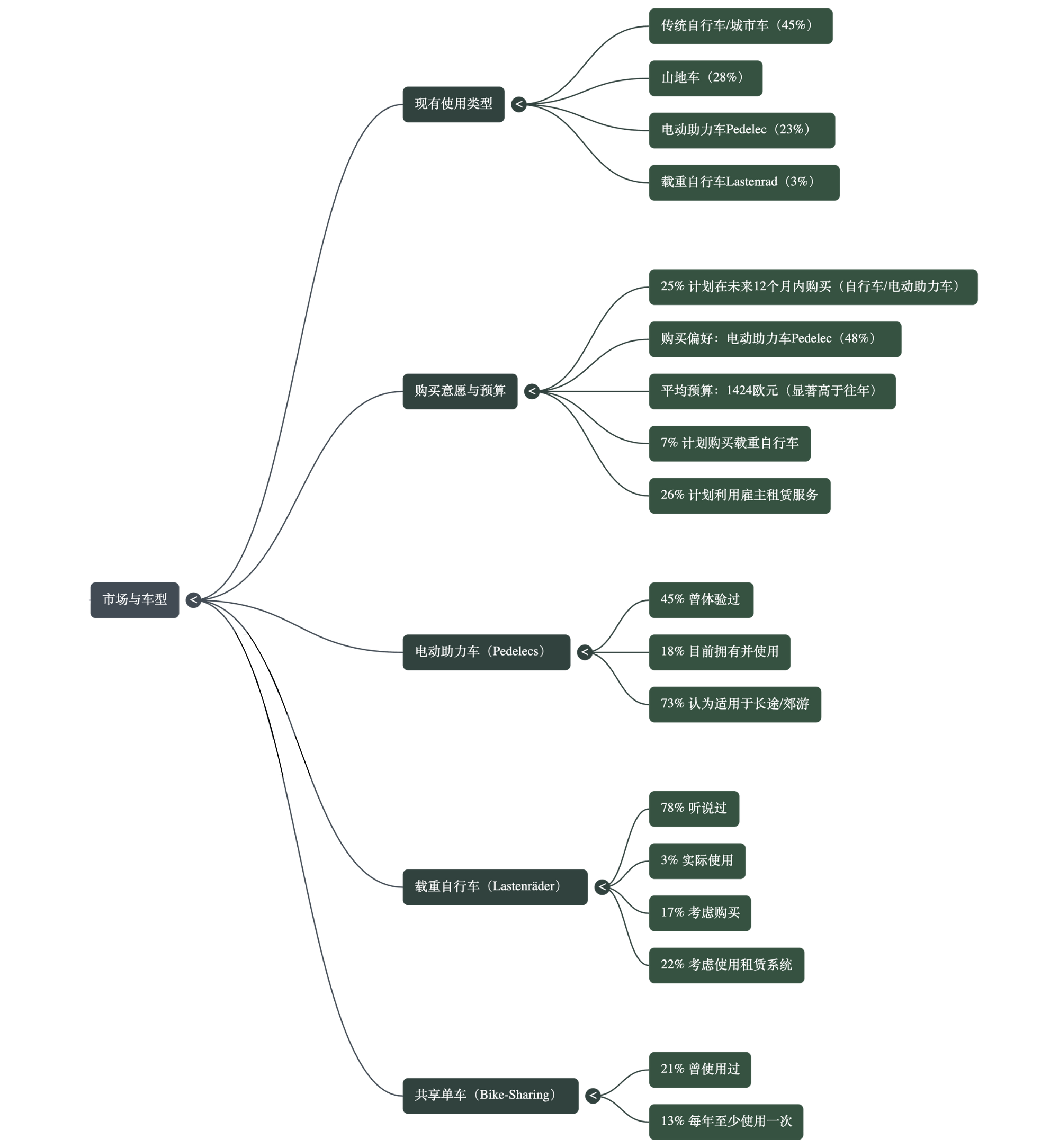 • 市场核心驱动力: 在所有计划在未来 12 个月内购买自行车或 Pedelec 的受访者中,48% 的人明确选择购买 Pedelec(电动自行车),使其成为意向买家中的首选类型。