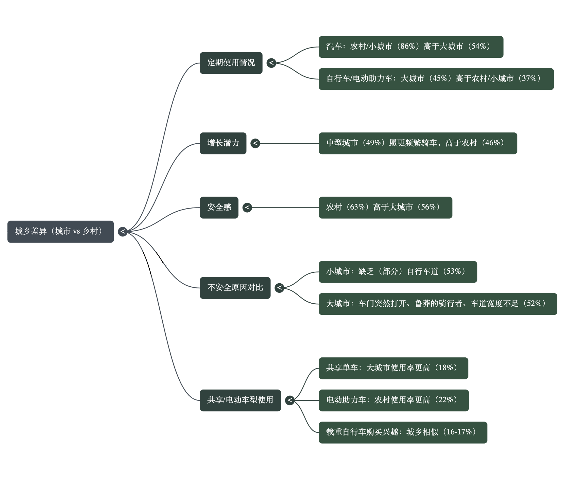 启示: 别只盯着大城市!乡村和小城镇的 E-Bike 渗透率(22%)其实完胜大城市(14%)。针对由于地形起伏大、单程距离远的乡村用户,主打“长续航”和“爬坡王”的产品将大有可为。